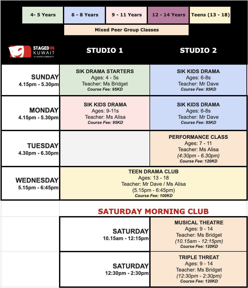 Staged in Kuwait is the country’s busiest Performing Arts school and Community Theatre. We run weekly performance arts classes for ages four to adult, and produce annual seasons of shows as a Community Theatre.